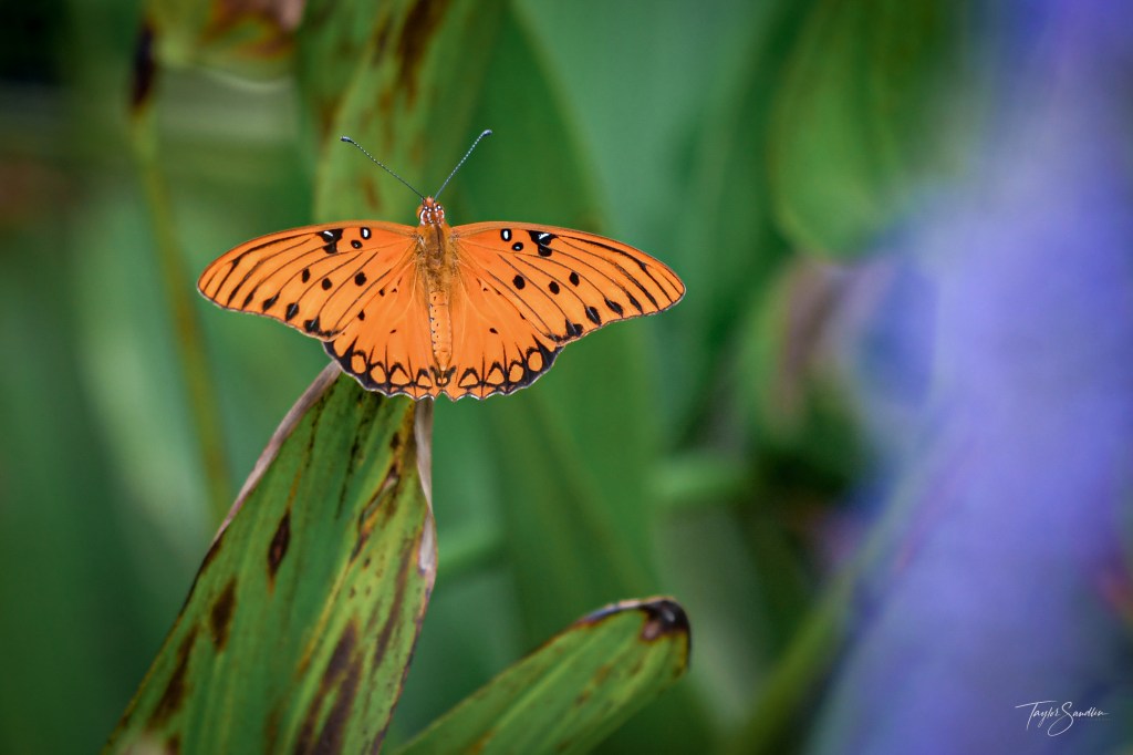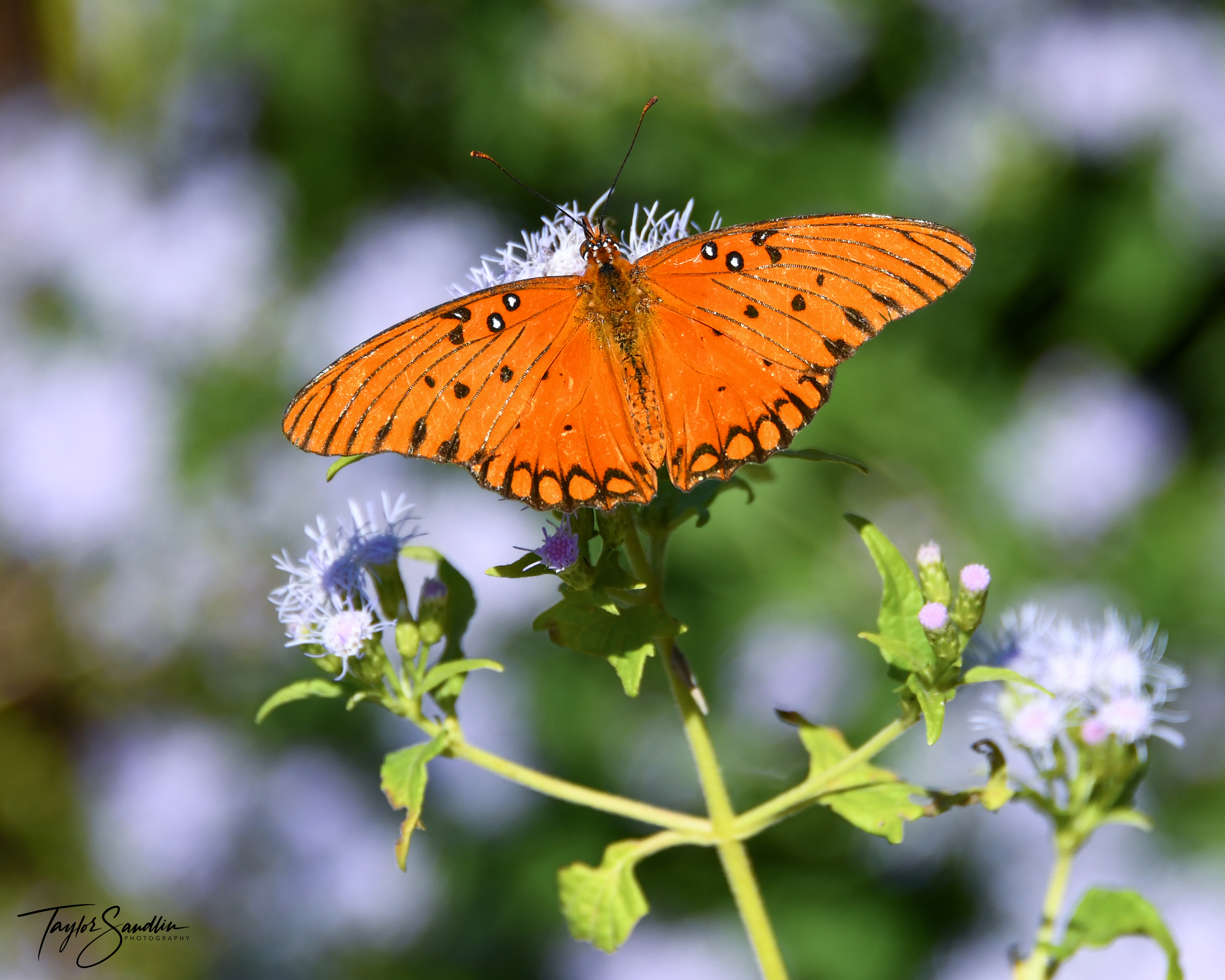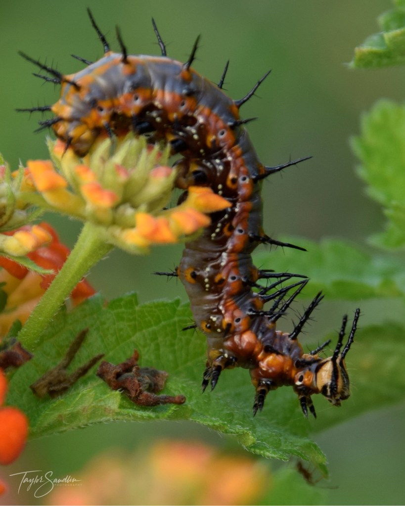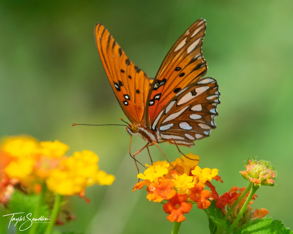I’ve found Gulf Fritillaries feeding on lantana, zenia, butterfly bush, and more. Its larva feed on passion vines.