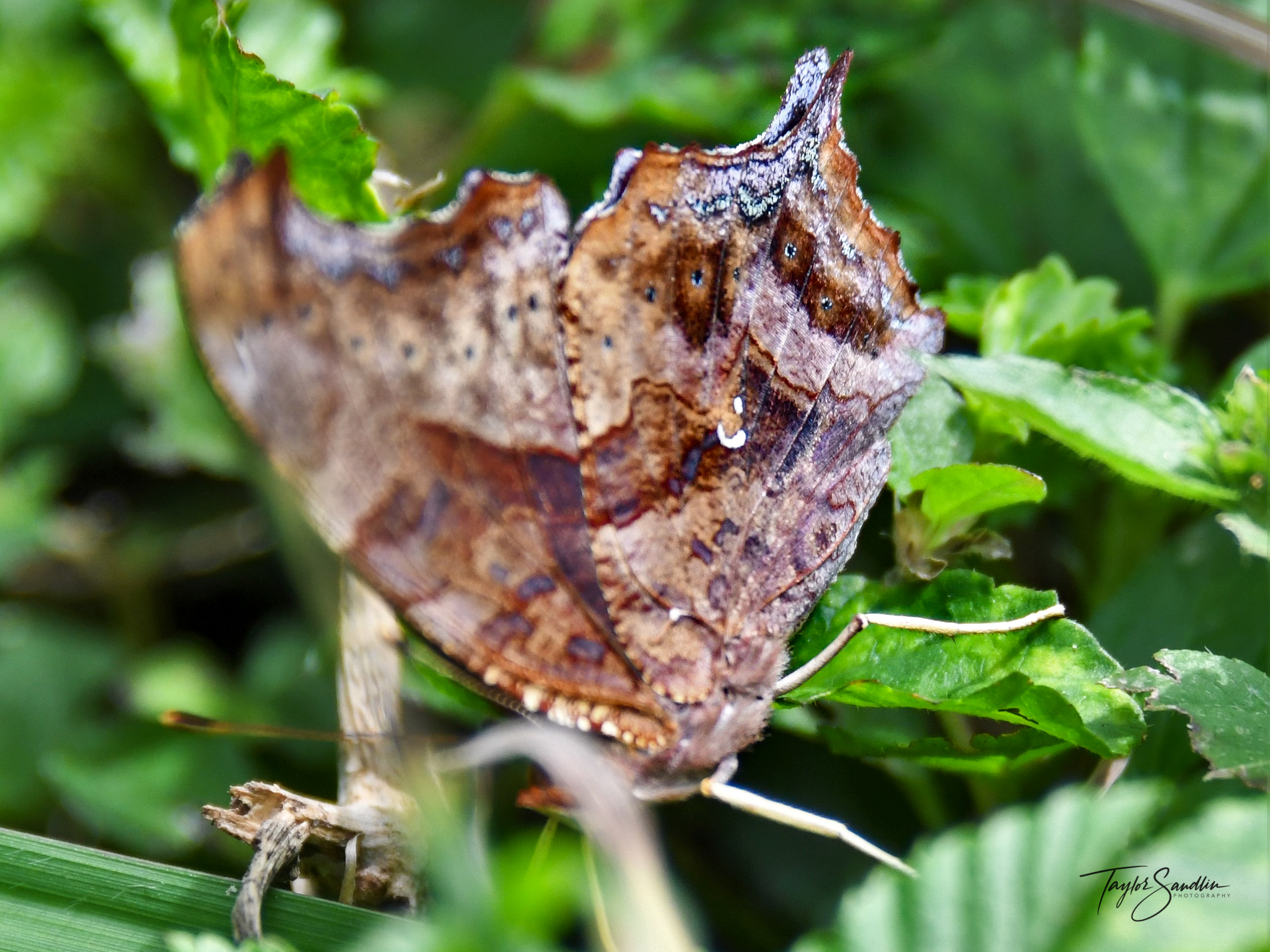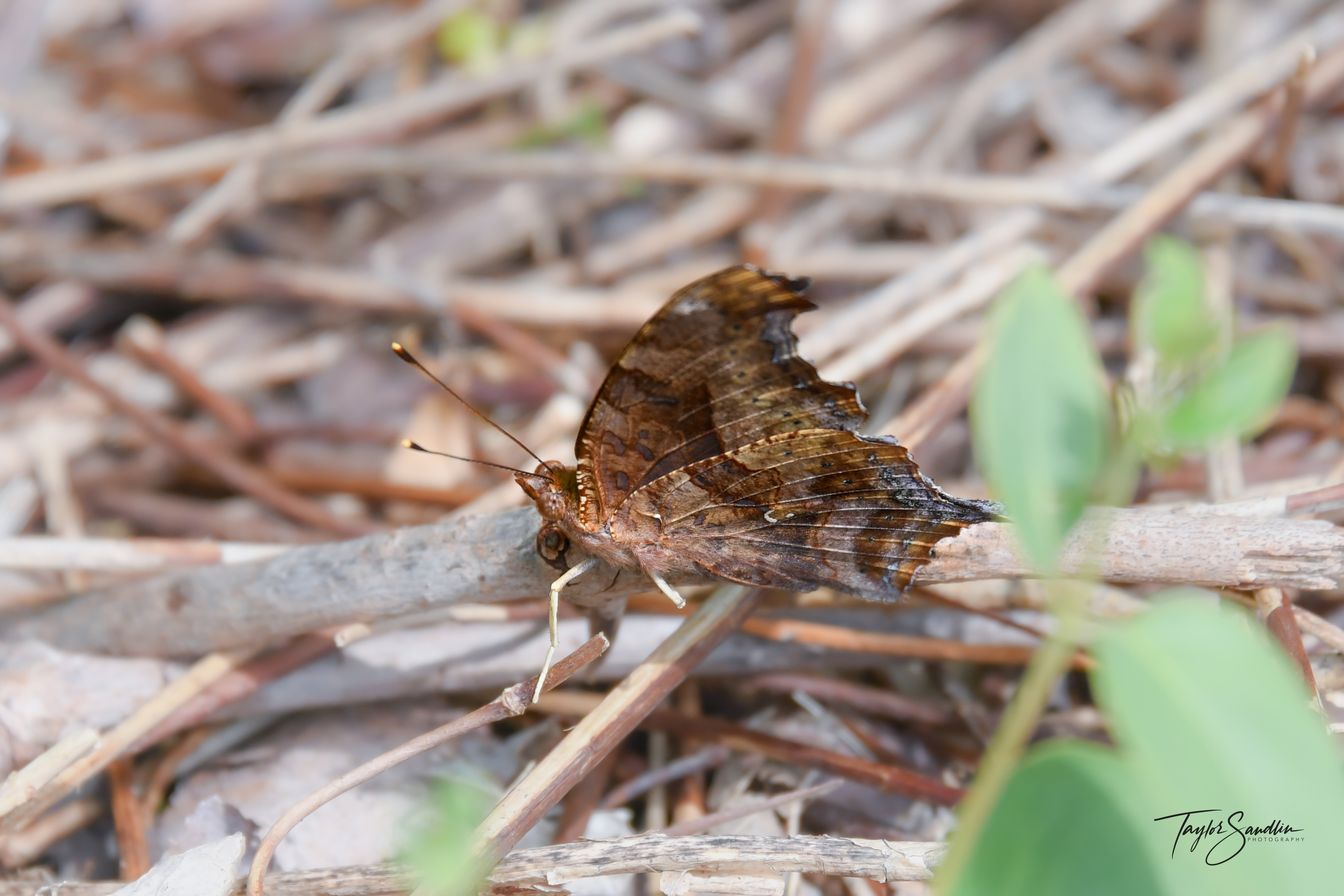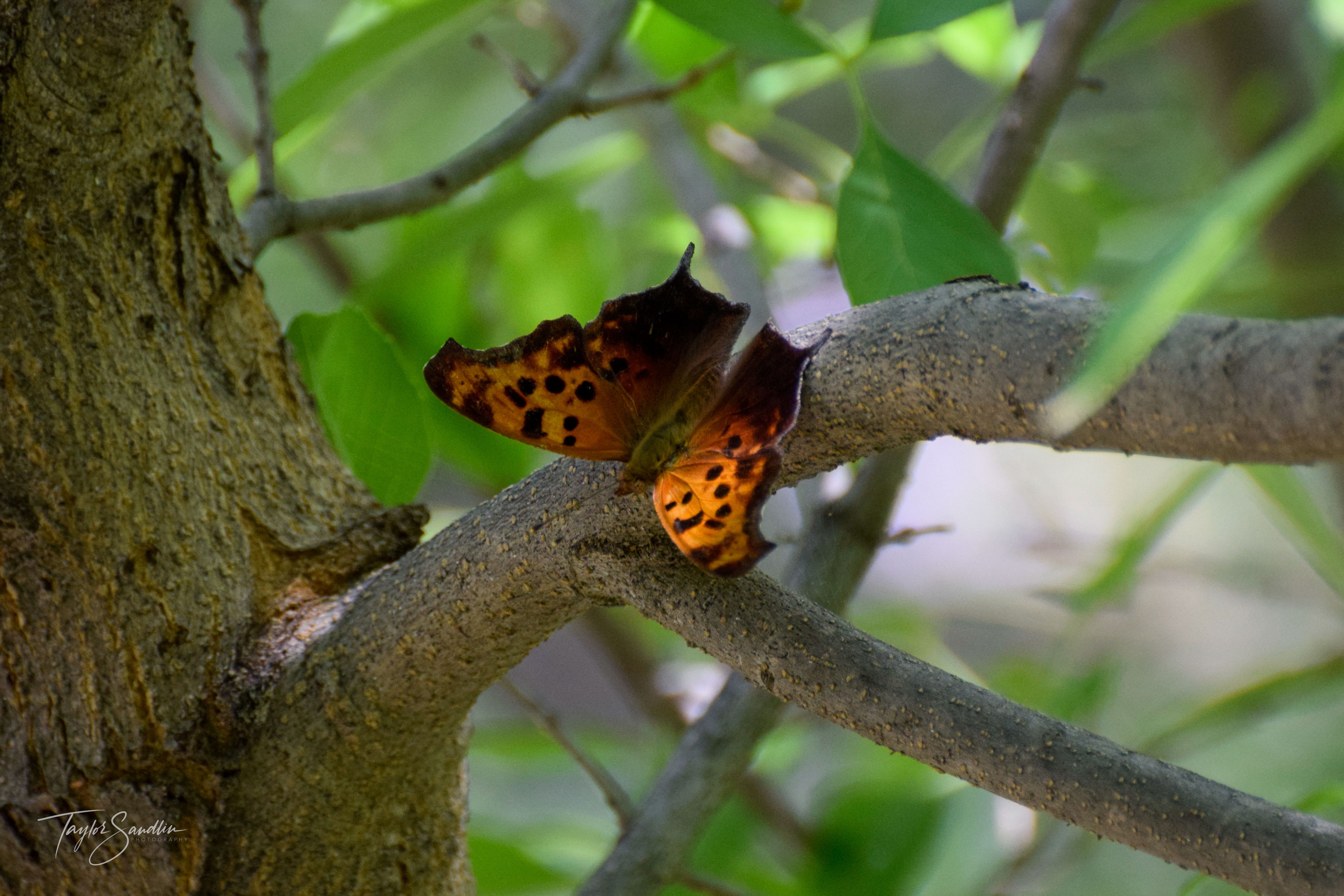 This anglewing butterfly will disappear in the trees. Its irregular wing shape makes it appear as one dead leaf among many. Still, its comma plus a dot silver markings set it apart as a “Question Mark” in the woodland areas of Texas.