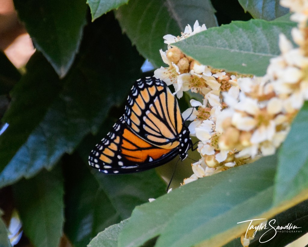Queens and Monachs are more elegant fliers, gliding through the air with their wings in a V shape. The Viceroy on the other hand has a strong flap-glide pattern with wings flatter than those of the butterflies it mimics.